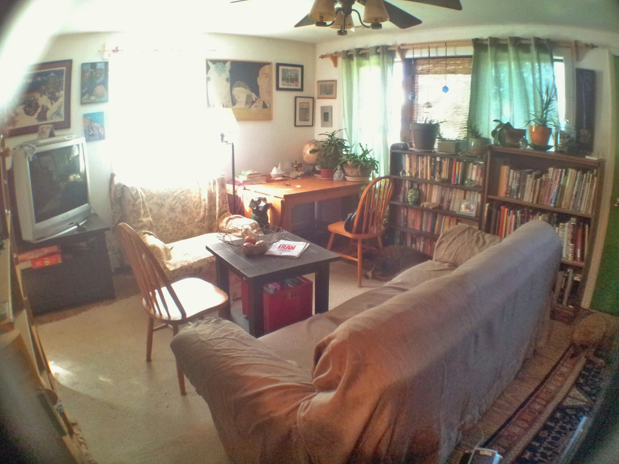 I have a house. It has what I suppose must be considered a living room, or maybe a waiting room. My house was either built in 1966, which makes it more or less my age, or sometime in the early 50s, depending on who you ask. A neighbor told me it was one of the first houses on this street but the city wrote every existent house down as 1966 because that’s when they all got connected to the city sewers. It looks mid century as it was built, and then it was added on to again and again, mostly in the 70s, oh yes, by a tribe of iconoclasts with little money or skill but boundless enthusiasm and a deeply strange source of random building materials. I am now one of this tribe, of course and it was me who cut the hole in the wall between the living room and the kitchen. One of these days when I am rich it will be me who raises the ceilings. However. That is not what this post is about. This post is about the goddamned undecoratable living room.