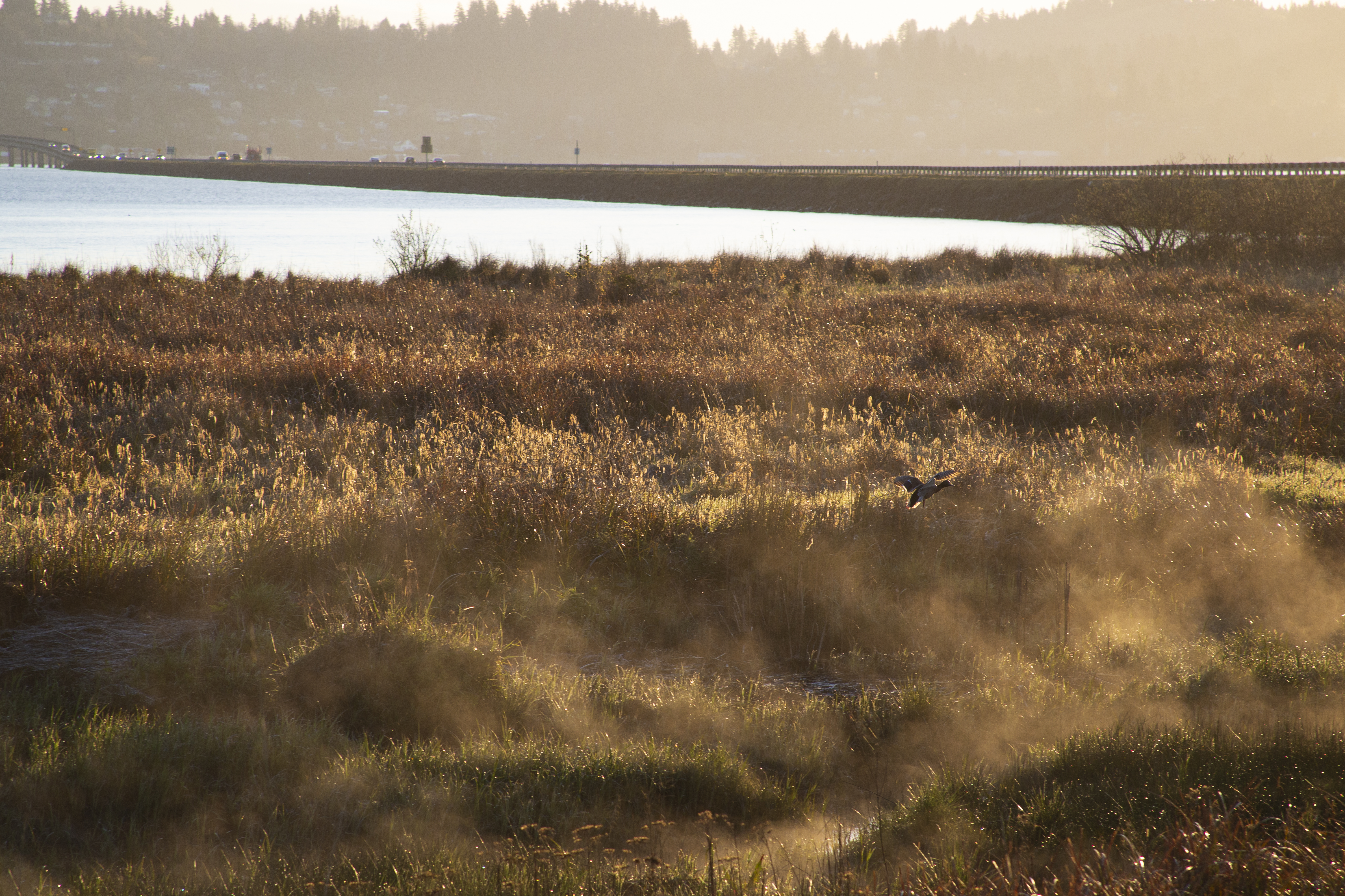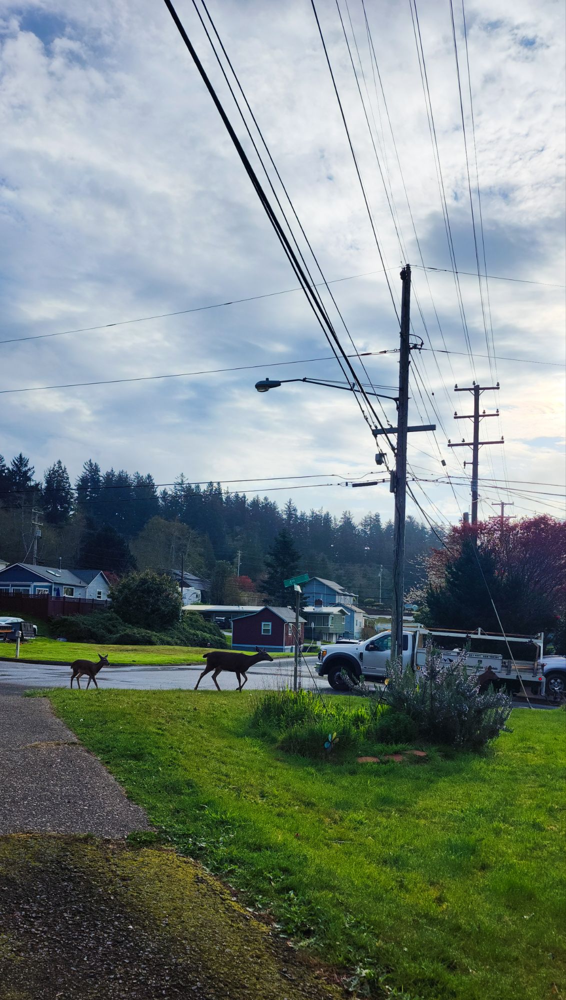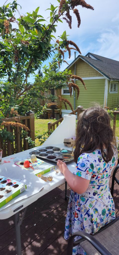 The photos and the week that was! On Sunday as previously discussed we dyed eggs on my daughter’s porch in the sunshine. Monday, this campus deer greeted me on my way to work. Tuesday, I left early so I could go spend 2 hours at the T Mobile store on behalf of my brother’s new phone and also walk the dog at the Fort Stevens historical area where, amid the broad daylight and the crowds of frisbee golfers, I encountered this completely nonchalant and well fed coyote. Wednesday I was in my office where this tiny vase, a gift from a colleague, was making me happy with a tiny flower plucked from the college grass. Thursday Harvey and I went for an early walk on two of my favorite parts of the Warrenton waterfront trail – we had to beat a hasty retreat from this part, due to of course other dogs. Friday morning the daily deer were in my yard and yesterday, Saturday, I took this over by the other side of the airport and I really like it. I like photos that are essentially stripes, because if you think about it, most landscapes are stripes. There are elk behind those trees by the way but you can’t see them from this angle. And if that isn’t a metaphor for life these days I do not know what is. Hope to see you all again next week!